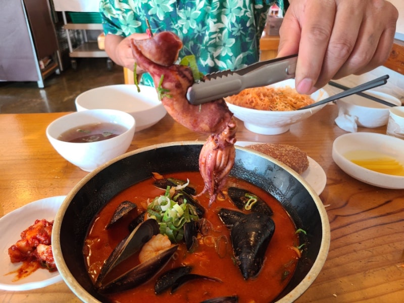 오징어가 한 마리 통째로 들어있고 홍합도 잔뜩이다.